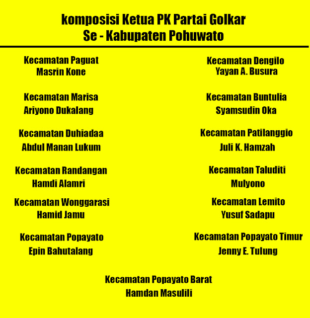 Wakil Ketua DPD II Partai Golkar Kabupaten Pohuwato Nasir Giasi mengatakan bahwa Musyawarah Kecamatan (Muscam) yang saat ini kami lakukan tidak lain untuk menciptakan atau meregenerasi pengurus-pengurus yang ada ditingkat Kecamatan, dan sesmua sudah sesuai dengan AD/ART Partai, dan saya berharap agar siapa saja yang terpilih menjadi Ketua PK, dirinya mampu untuk menjalankan rangkaian-rangkaian perjuangan Partai Golkar di Kancah Politik Mendatang.” Jelas Nasir