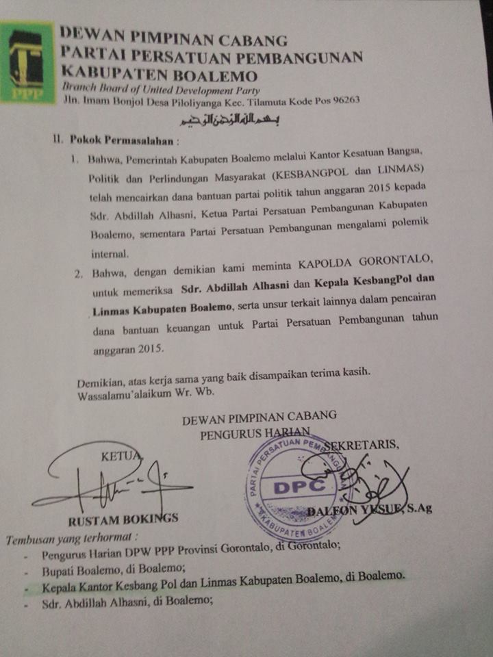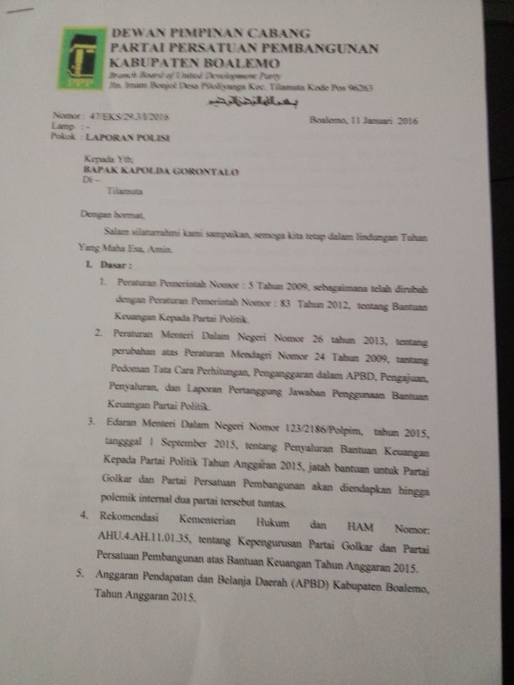Faktanews.com (Hukum) – Gorontalo DPC PPP Boalemo telah melaporkan Abdillah Alhasni—Ketua DPD PPP kubu Romahurmuziy dan KesbangPol Kabupaten Boalemo ke Polda Gorontalo, Senin (11/1). Pasalnya, Abdillah yang juga ketua Fraksi PPP DPRD Boalemo telah mencairkan dana partai yang seharusnya belum bisa digelontorkan, sebab masih dualisme kepengurusan, yakni PPP kubu Romahurmuziy dan PPP versi Djan Faridz. Demikian halnya PPP di Kabupaten Bone Bolango yang kasusnya sama. Oleh sebab itu, Polda Gorontalo diminta mengusut sekalian kasus tersebut. Edaran Mendagri Nomor 123/2186/Polpin, tahun 2015, tanggal 1 September 2015, tentang Penyaluran Bantuan Keuangan Kepada Partai Politik Tahun Anggaran 2015, jatah bantuan untuk Partai Gorlkar dan PPP akan diendapkan hingga polemik internal dua partai itu tuntas. Namun Kesbangpol di dua daerah itu telah berani mengeluarkan dana yang bersumber dari APBD. Akibatnya, DPC PPP Boalemo dan DPC PPP Bone Bolango gigit jari—tidak lagi mendapatkan dana partai dari APBD.