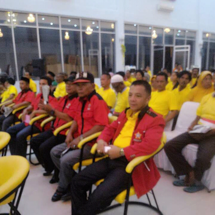 Thasrief Haras, salah satu Aparatur Sipil Negara yang saat ini menjabat sebagai Camat Duhiadaa ini terlihat menggunakan kemeja kuning yang ditutup dengan atribut organisasi berwarna hitam ini duduk didepan kader-kader Paryai Golkar dengan senyum khasnya.