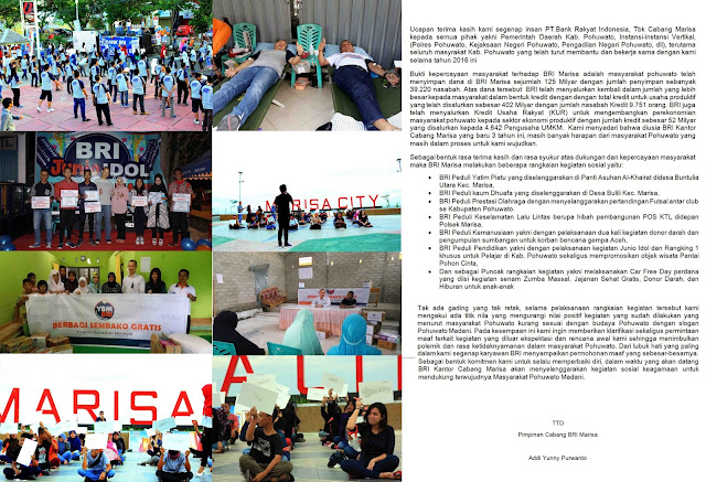 Kami menyadari bahwa diusia BRI Kantor Cabang Marisa yang baru 3 tahun ini, masih banyak harapan dari masyarakat Pohuwato yang masih dalam proses untuk diwujudkan.