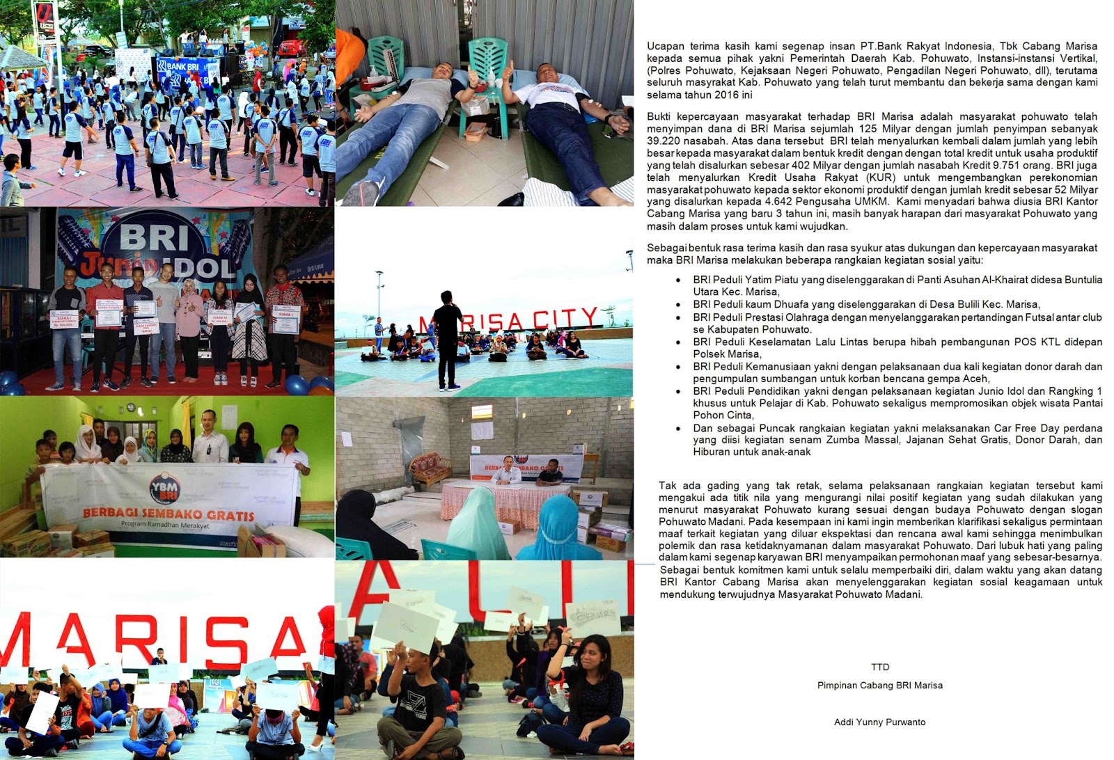 Tak ada gading yang tak retak, selama pelaksanaan rangkaian kegiatan tersebut kami mengakui ada titik nila yang mengurangi nilai positif kegiatan yang sudah dilakukan yang menurut masyarakat Pohuwato kurang sesuai dengan budaya Pohuwato dengan slogan Pohuwato Madani. Pada kesempaan ini kami ingin memberikan klarifikasi sekaligus permintaan maaf terkait kegiatan yang diluar ekspektasi dan rencana awal kami sehingga menimbulkan polemik dan rasa ketidaknyamanan dalam masyarakat Pohuwato. Dari lubuk hati yang paling dalam kami segenap karyawan BRI menyampaikan permohonan maaf yang sebesar-besarnya. Sebagai bentuk komitmen kami untuk selalu memperbaiki diri, dalam waktu yang akan datang BRI Kantor Cabang Marisa akan menyelenggarakan kegiatan sosial keagamaan untuk mendukung terwujudnya Masyarakat Pohuwato Madani.(Hms-Jho)