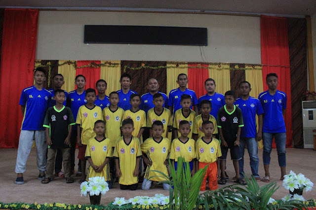 Capts : Ketua Askab, Nasir Giasi dan seluruh pemain U-12 SSB Kabupaten Pohuwato berfose bersama dalam acara pelepasan para pemain yang akan berlaga di Turnamen Danone Manado, Rabu (8/3) kemarin. (F. Jhun).