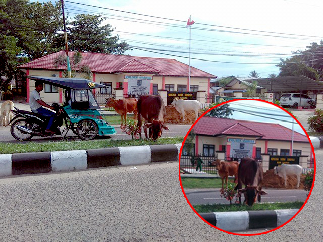 | Caption : Hewan Ternak Yang Menghalangi Pengendara Bentor dan Memakan Tanaman Yang Berada Di Median Jalan Depan Polsek Marisa |