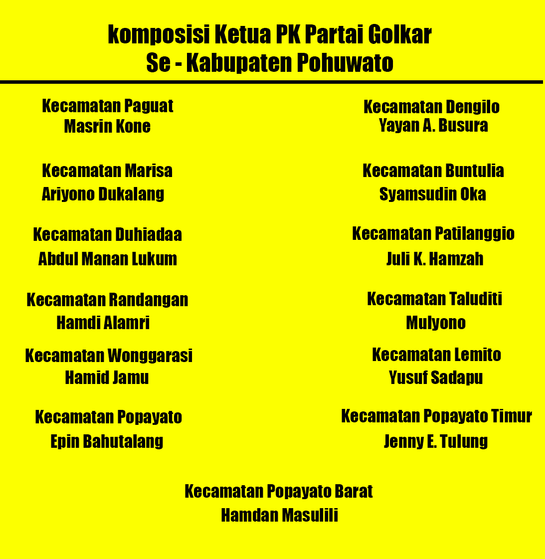 Wakil Ketua DPD II Partai Golkar Kabupaten Pohuwato Nasir Giasi mengatakan bahwa Musyawarah Kecamatan (Muscam) yang saat ini kami lakukan tidak lain untuk menciptakan atau meregenerasi pengurus-pengurus yang ada ditingkat Kecamatan, dan sesmua sudah sesuai dengan AD/ART Partai, dan saya berharap agar siapa saja yang terpilih menjadi Ketua PK, dirinya mampu untuk menjalankan rangkaian-rangkaian perjuangan Partai Golkar di Kancah Politik Mendatang.” Jelas Nasir