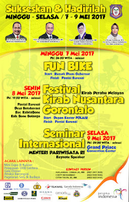 Event Festival Kirab Nusantara yang akan dibuka pada 07 hingga 09 Mei 2017 ini dirangkaikan dengan Fun Bike dengan rute start Rumah Jabatan Gubernur gorontalo serta finish di kawasan pantai kurenai ini diprediksikan akan dibanjiri oleh masyarakat Provinsi Gorontalo.