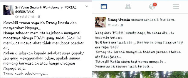 Pemilik akun Facebook bernama Sri Yulan Sugiarti Wartabone dan Deasy Ilnesia dalam postingannya mempertanyakan kerja dari pihak PDAM Bone bolango yang seakan tidak peduli dengan keadaan masyarakatnya yang sudah 6 hari tidak mendapatkan air bersih padahal setiap bulannya petugas datang menagih rupa “B**i” seperti yang ditulis dalam postingannya.