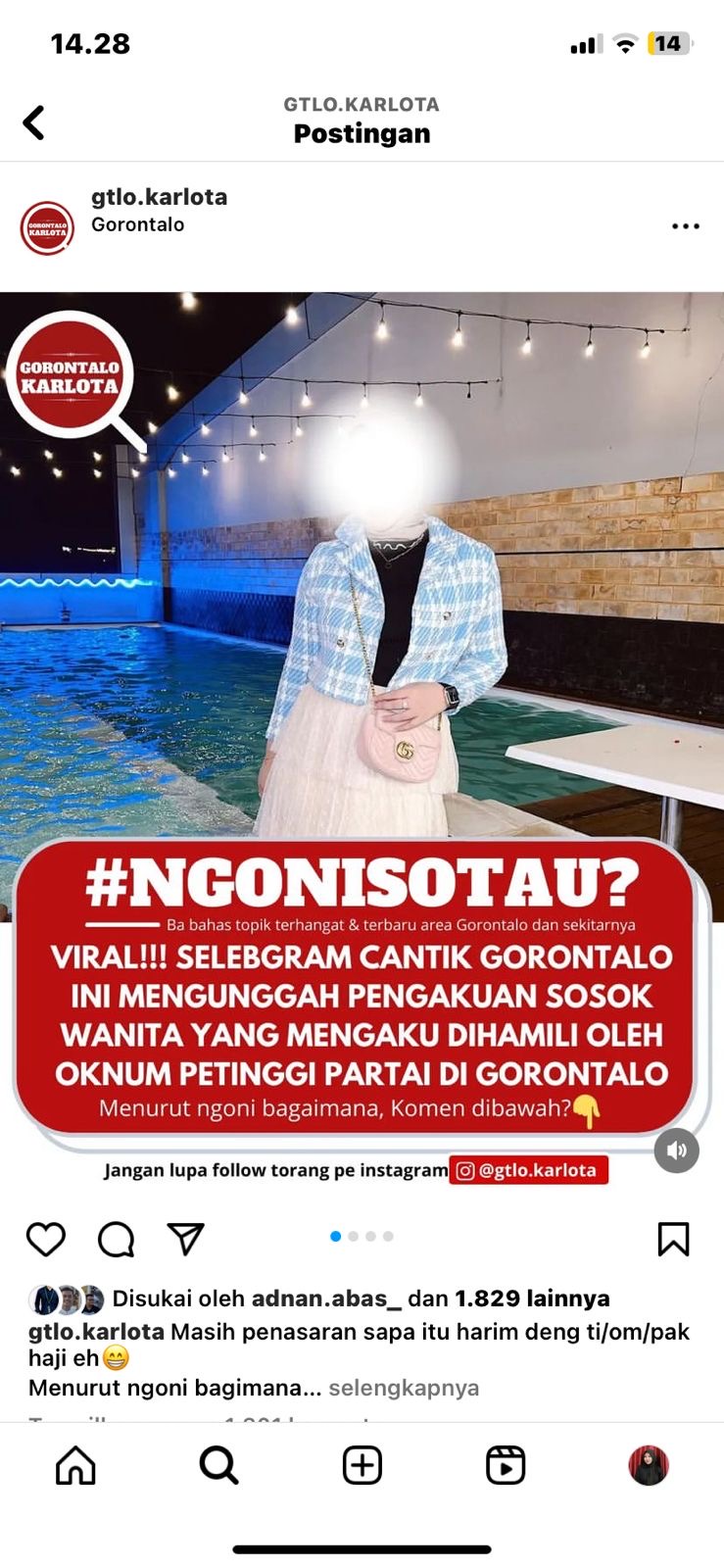 Dalam instastory akun @gtlo.karlota, menyatakan ” Viral!!! Selebgram Cantik Gorontalo Mengunggah Pengakuan Sosok Wanita Yang Mengaku Dihamili Oleh Oknum Petinggi Partai Di Gorontalo “