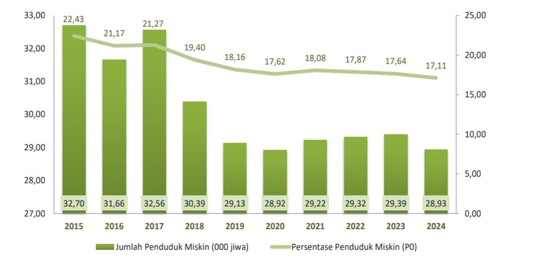 Persentase penduduk miskin pada tahun 2024 tercatat sebesar 17,11 persen, menurun 0,53 persen poin terhadap tahun 2023.