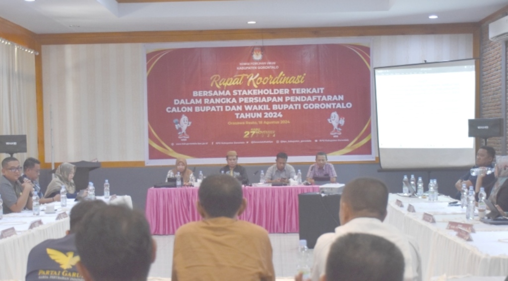 Faktanews.com, Kab. Gorontalo – KPU Kabupaten Gorontalo menggelar rapat koordinasi bersama stakeholder terkait, dalam rangka persiapan pendaftaran calon Bupati dan Wakil Bupati Gorontalo, Pilkada 2024, Minggu (18/8/2024).