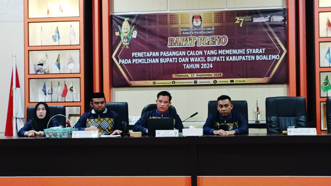 Faktanews.com, Boalemo – Komisi Pemilihan Umum (KPU) Kabupaten Boalemo menetapkan kelima bakal pasangan calon sebagai calon Bupati dan Wakil Bupati Kabupaten Boalemo, pada Minggu (22/9/2024).