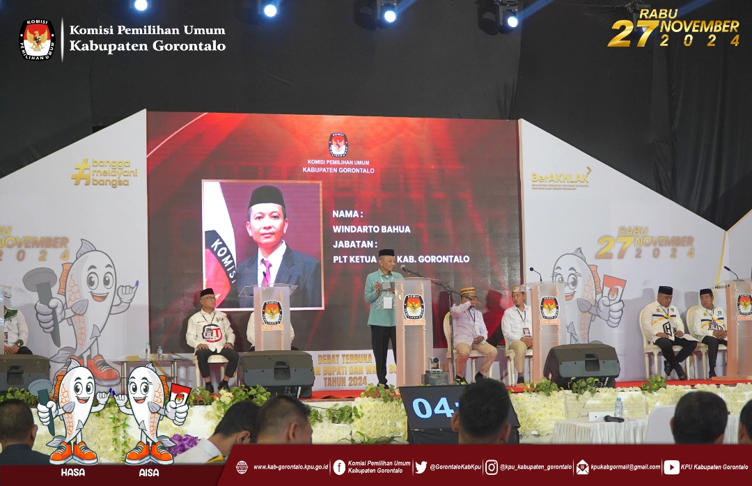 Dalam sambutannya, Windarto Bahua menyampaikan bahwa debat pertama ini adalah kesempatan bagi pasangan calon untuk menyampaikan visi, misi, dan program kerja mereka secara langsung kepada masyarakat. Ia menekankan bahwa debat ini disiarkan secara langsung, sehingga hampir seluruh masyarakat Kabupaten Gorontalo dapat menyaksikan dan mengenal lebih jauh calon-calon yang akan mereka pilih pada 27 November 2024 nanti.