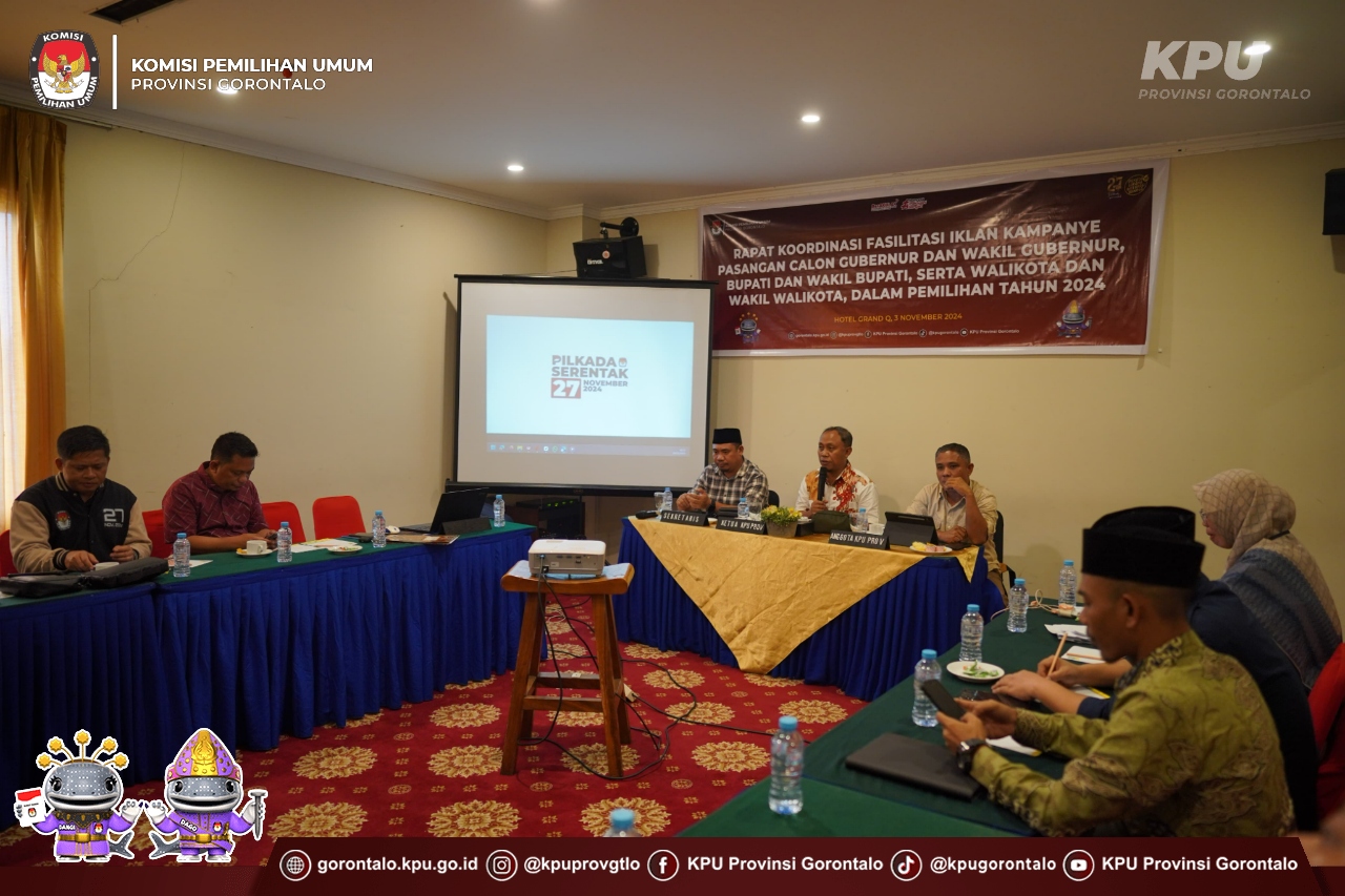 Faktanews.com, Bone Bolango – Ketua KPU Provinsi Gorontalo, Sophian Rahmola, bersama dengan Anggota KPU Provinsi Gorontalo, Opan Hamsah dan Risan Pakaya, membuka acara Rapat Koordinasi Fasilitasi Iklan Kampanye untuk Pasangan Calon Gubernur dan Wakil Gubernur, Bupati dan Wakil Bupati, serta Walikota dan Wakil Walikota dalam Pemilihan Tahun 2024. Acara ini berlangsung di Hotel Garand Q Kota Gorontalo pada Minggu (3/11/2024).
