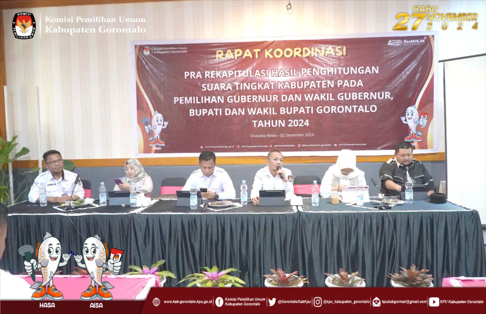 Faktanews.com, Kab. Gorontalo – KPU Kabupaten Gorontalo menggelar rapat koordinasi (Rakor) pra rekapitulasi hasil penghitungan suara tingkat kabupaten untuk Pemilihan Gubernur dan Wakil Gubernur, serta Bupati dan Wakil Bupati Gorontalo tahun 2024, Senin (2/12/2024).