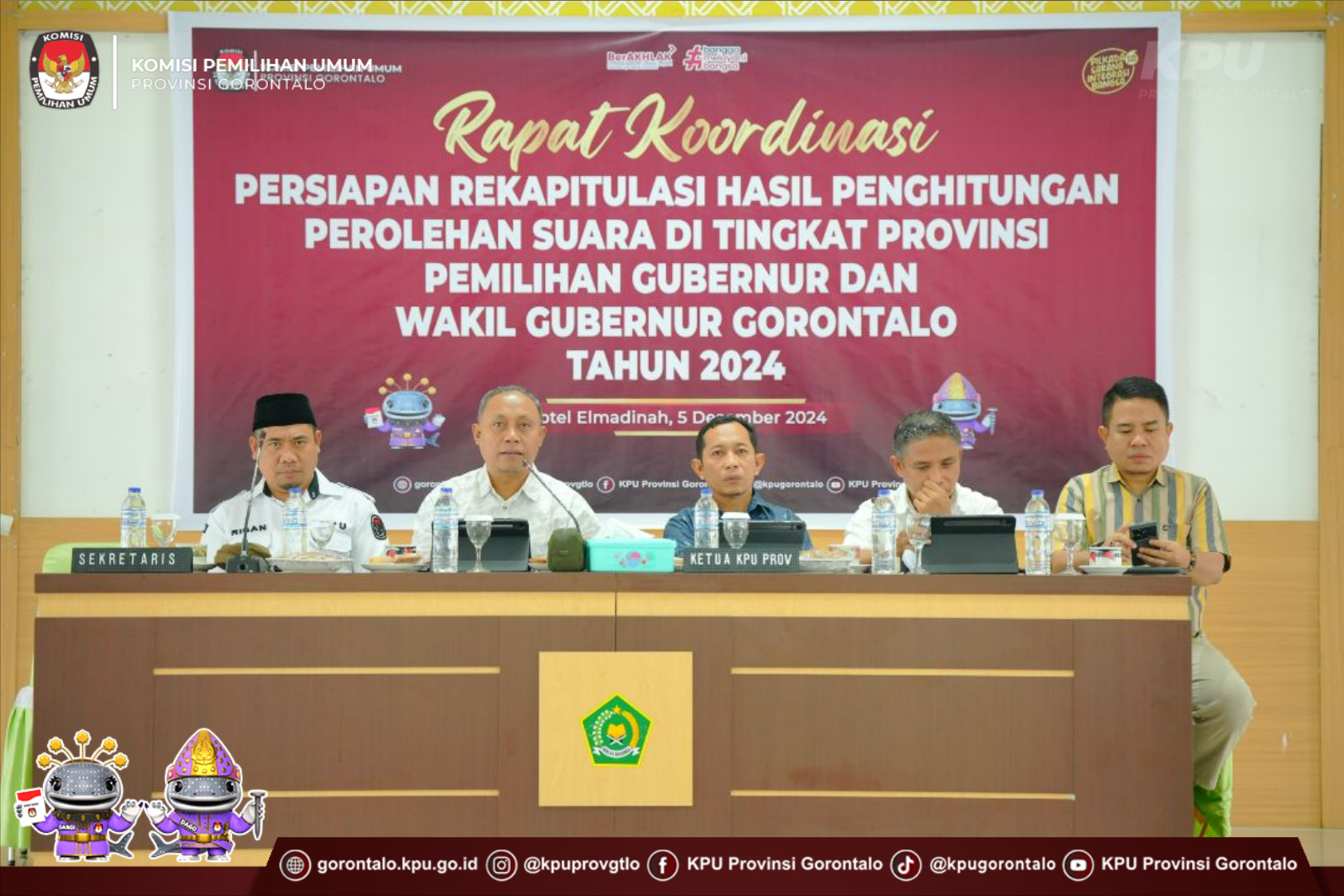 Faktanews.com, Bone Bolango – Ketua KPU Provinsi Gorontalo, Sophian Rahmola, bersama para anggota menggelar Rapat Koordinasi (Rakor) terkait persiapan rekapitulasi hasil penghitungan perolehan suara di tingkat provinsi untuk Pemilihan Gubernur dan Wakil Gubernur Gorontalo Tahun 2024. Acara ini berlangsung di Hotel Elmadinah pada Kamis, 5 Desember 2024.
