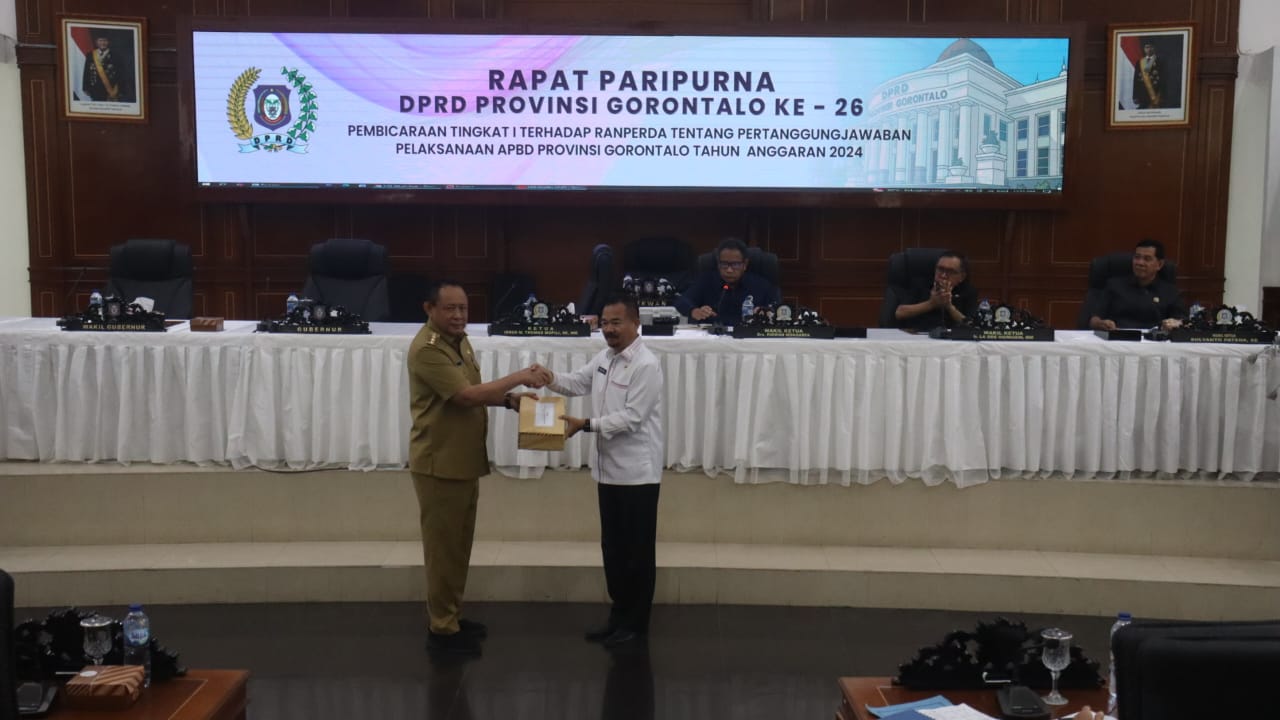 Faktanews.com, Gorontalo – DPRD Provinsi Gorontalo menggelar rapat paripurna ke-26 membahas Rancangan Peraturan Daerah (Ranperda) Pertanggungjawaban Pelaksanaan APBD Tahun Anggaran 2024. Rapat dipimpin Ketua DPRD Thomas Mopili bersama jajaran pimpinan dewan, Gubernur Gorontalo Gusnar Ismail, serta perwakilan OPD.