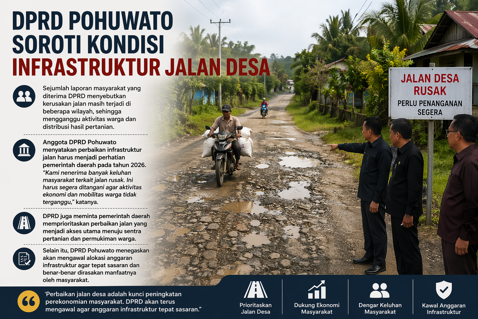 Faktanews.com, Pohuwato – DPRD Pohuwato menyoroti kondisi sejumlah ruas jalan desa yang mengalami kerusakan dan membutuhkan penanganan segera.