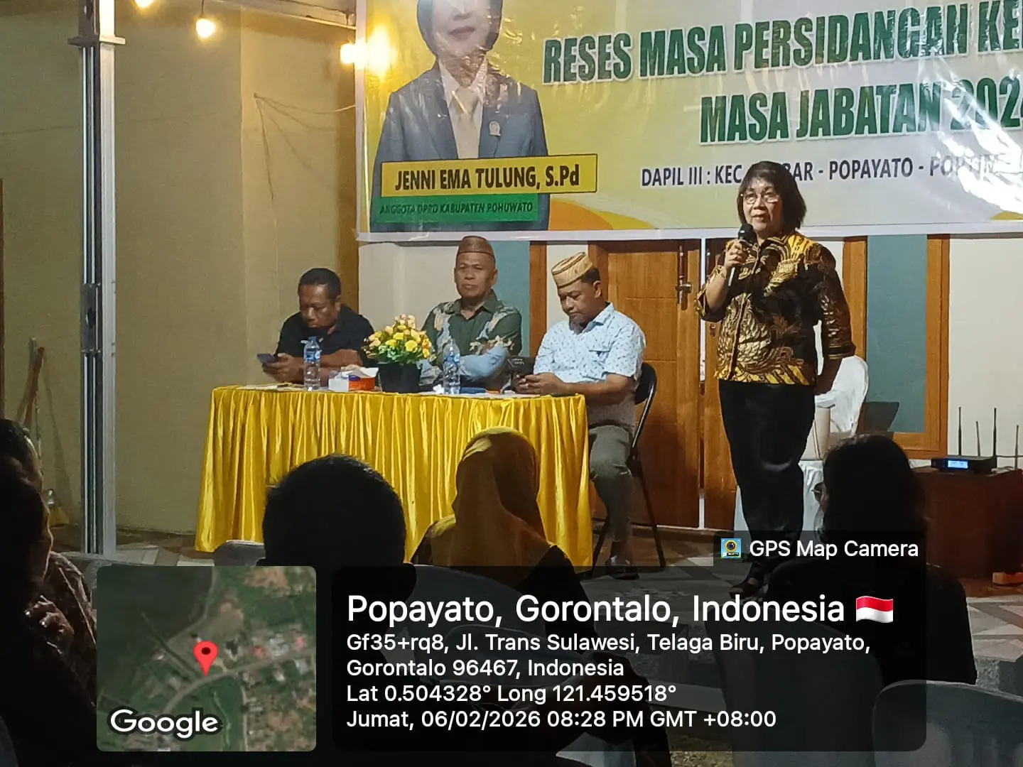 Faktanews.com, Kota Gorontalo – Anggota DPRD Pohuwato dari Partai Golkar, Jenni Ema Tulung, menggelar reses masa persidangan kedua tahun kedua di Desa Telaga Biru, Kecamatan Popayato, Jumat (6/2/2026).