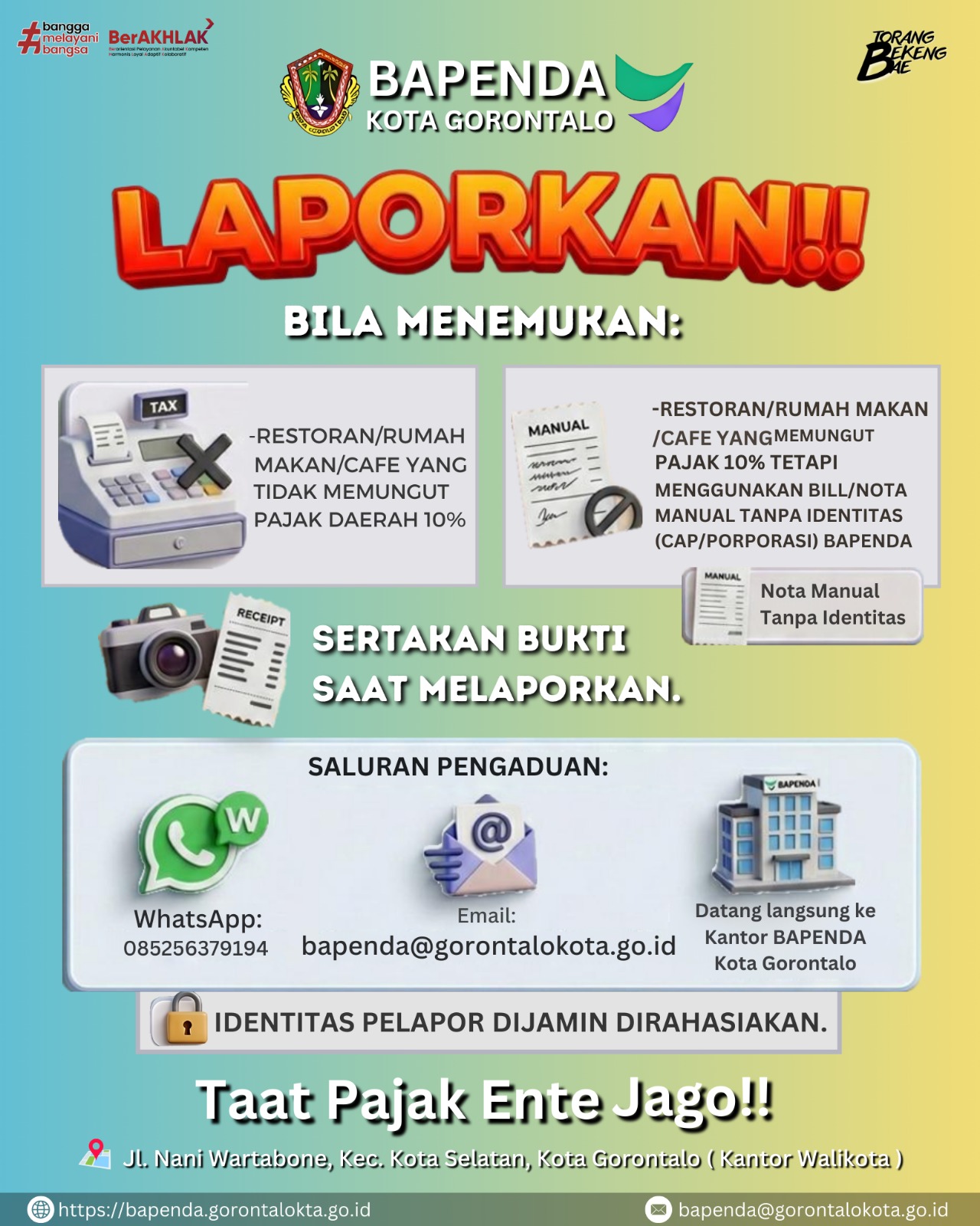 Guna mempermudah pelaporan, Bapenda menyediakan sejumlah kanal pengaduan, mulai dari layanan WhatsApp di nomor 0852-5637-9194, email bapenda@gorontalokota.go.id, hingga layanan langsung di kantor Bapenda.