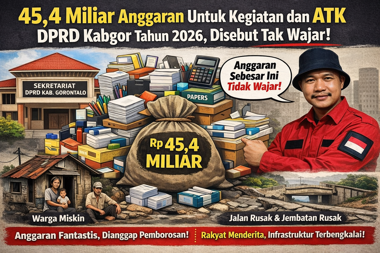 FAKTA NEWSGORONTALO. Semua orang dibuat geleng-geleng kepala. Di saat masyarakat Kabupaten Gorontalo masih berkutat dengan kemiskinan, jalan rusak, dan infrastruktur yang memprihatinkan, Sekretariat DPRD justru menganggarkan Rp45,4 miliar hanya untuk kebutuhan kegiatan dan Alat Tulis Kantor (ATK) pada tahun 2026.